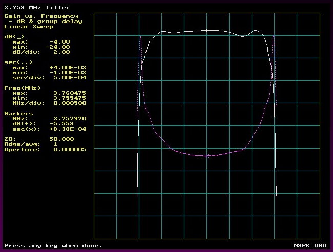 | This is a plot of the previous filter's passband insertion loss in dB and group delay, also tested by Harold, and plotted by a VNA group delay test program. This plot, at 2 dB per vertical division and 0.5 kHz per horizontal divison, shows that the passband ripple is under 1 dB and the 6 dB bandwidth is 2.9 kHz. The group delay below, being the derivative of phase with respect to frequency, also quantifies the degree of linearity of the filter's phase vs. frequency characteristic in passband, as seen in the above plot. The sharp increases in group delay at the ends of the passband, about 2.7 milliseconds in this case, are characteristic of filters that have been optimized for skirt selectivity. These group delay 'ears' represent a loss in fidelity that can be particularly troublesome in narrow CW and data filters. |