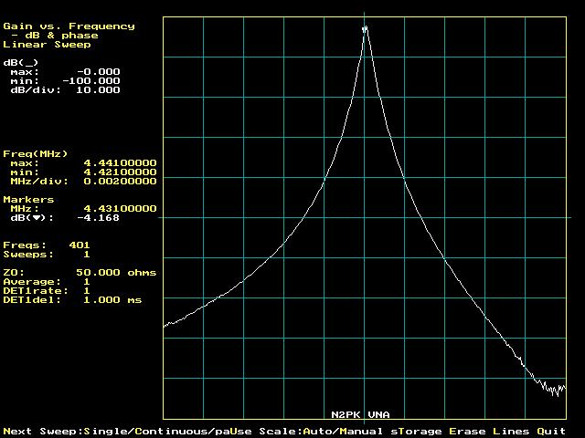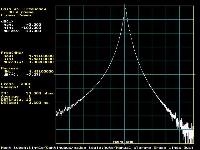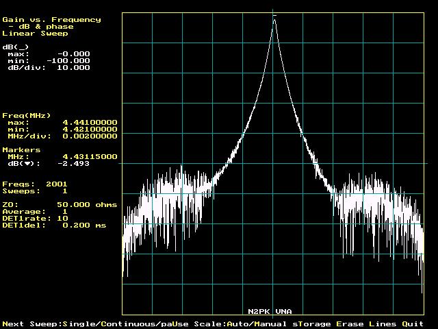 | Summary The extent of VNA dynamic range degradation with very poor master oscillator phase noise was not anticipated when I wrote in Part 2: "The master oscillator clocks both DDSs at the same times, every 6.74 ns approximately, in essentially lock-step fashion with the same jitter applied to both DDS outputs. Conventional VNA testing depends on relative phase, and relative phase between the two DDSs is preserved, given the various operative time constants generally encountered. The only exception that I can imagine would be a test of an extremely narrowband filter. Even that seems unlikely given the 5 Hz detector bandwidth." The most severe degradation occurs where the ADC digitally controlled bandwidth is opened up to accomodate the higher ADC conversion rates. What was essentially overlooked here was the fact that the master oscillator phase noise, as scaled to the DDS outputs, acts in combination with the offset passband of a narrowband DUT to magnify the phase noise of the RF DDS passed to the detector relative to the desired response - i.e. when the DDS frequency is not in the DUT passband. This noise response is also increased due to the wider digital (and analog) bandwidths when the ADC is running at its faster conversion rates (about 6 kHz noise bandwidth @ the fastest rate). |